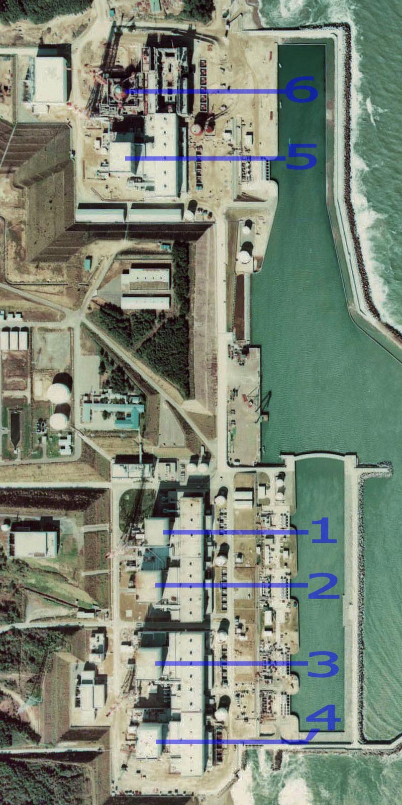 Aerial view of the station in 1975, showing separation between units 5 and 6, and 1–4. Unit 6, not completed until 1979, is seen under construction. (n.d.). Retrieved from Wikipedia: https://en.wikipedia.org/wiki/Fukushima_nuclear_disaster#/media/File:Fukushima_I_NPP_1975_medium_crop_rotated_labeled.jpg